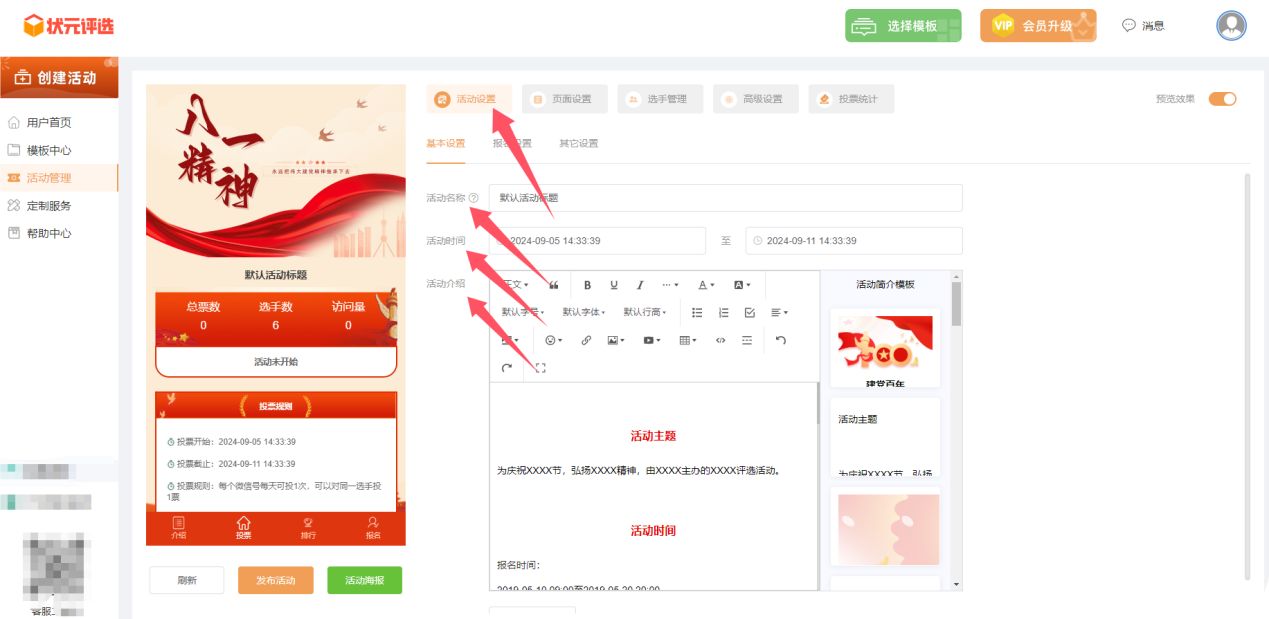 其次,在【活动设置】里面,修改活动的名称、设置活动时间、编辑活动介绍。