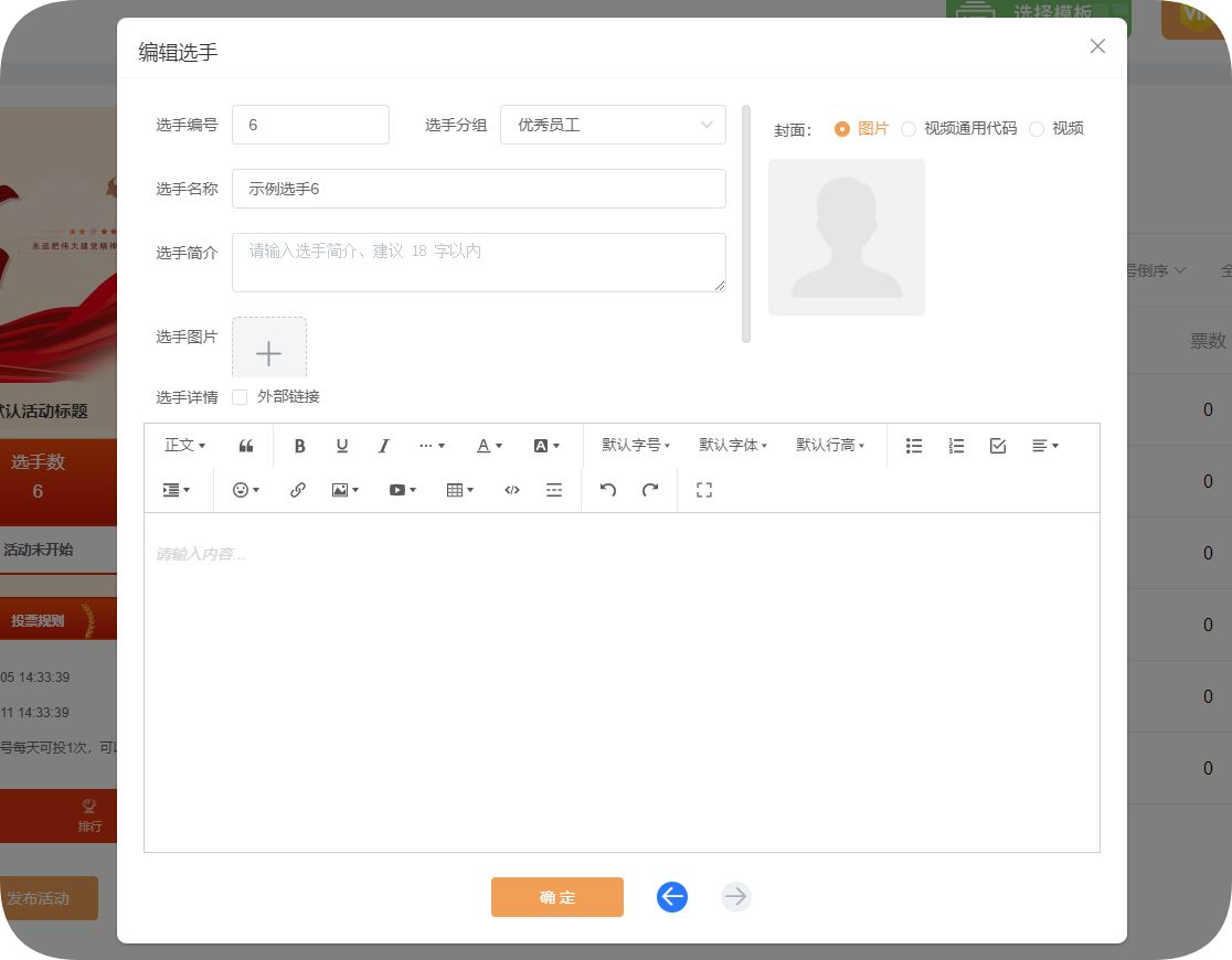 然后,在【选手管理】里面,上传所有选手的个人资料,包括选手的名称、简介、照片等。