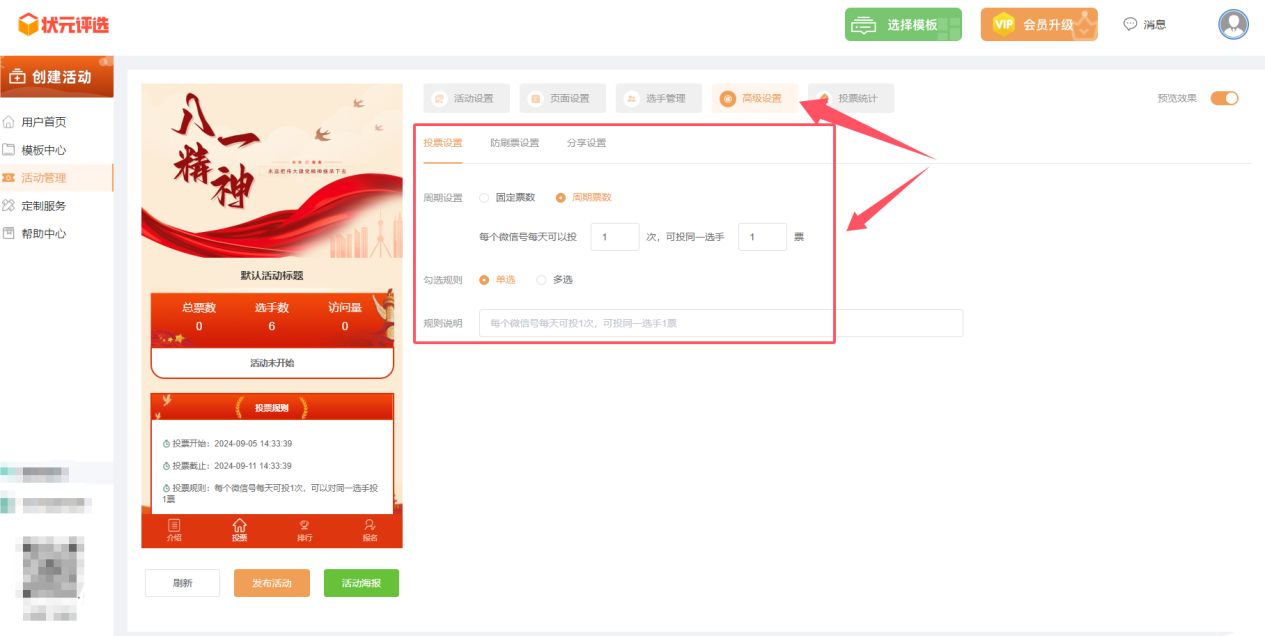 再然后,在【高级设置】里面,完成投票规则的设置。