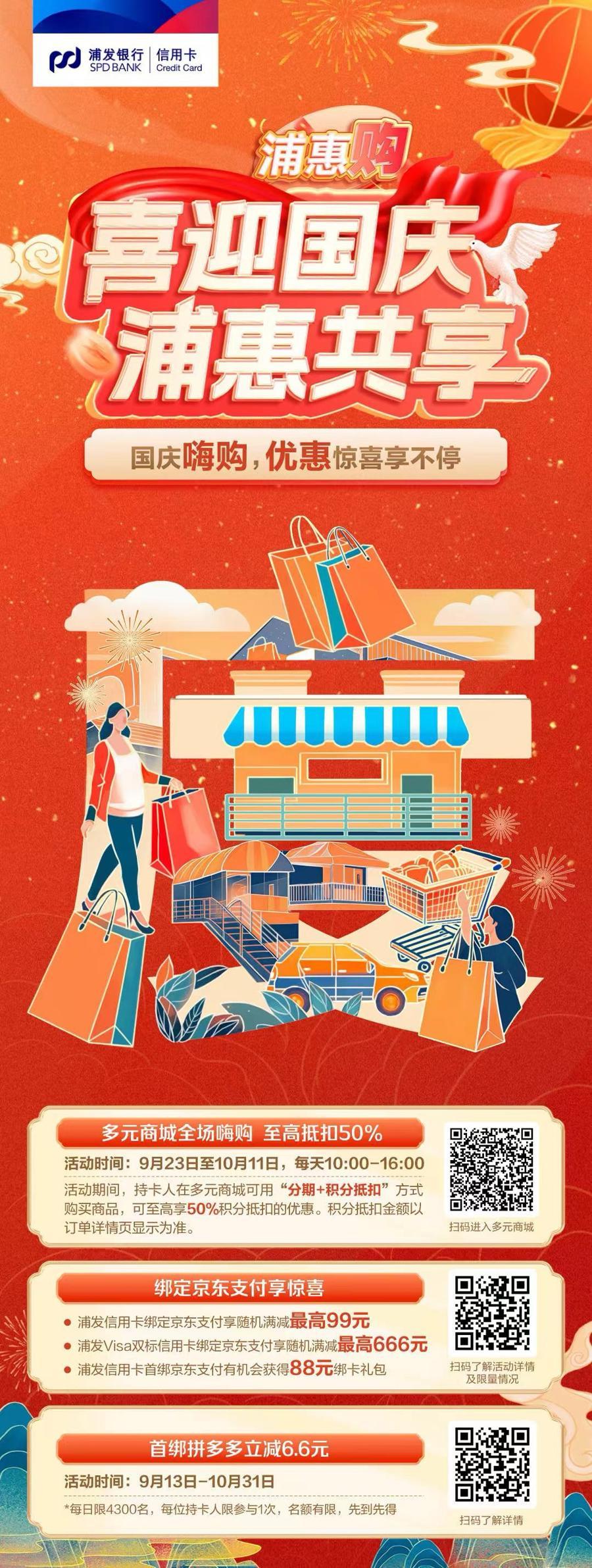 基于对持卡人线上购物习惯的深度洞察,浦发银行信用卡在“喜迎国庆 浦惠共享”活动中,于内通过购物平台多元商城,围绕存量积分,创新推出“分期+积分抵扣”的机制支持客户购买商品,持卡人限时至高可享受50%积分抵扣的优惠。于外结合头部电商平台京东、拼多多,以“绑卡支付,满额立减”的主线优惠,提升持卡人支付体验。