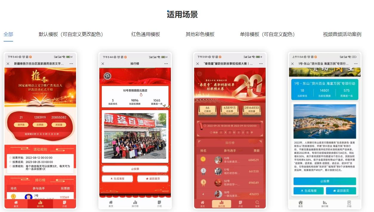 模板样式丰富才能全方位满足各类型投票活动的风格,评选星支持自定义设置页面元素,还有经验丰富的模板制作团队,针对各个行业各个使用场景有不同的模板,可以一键切换模板的设计风格。