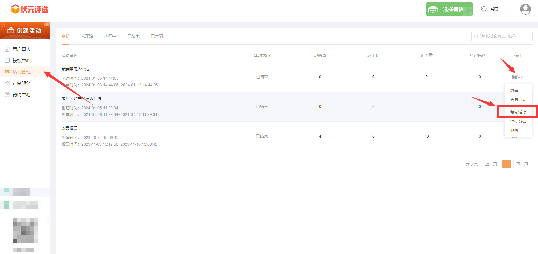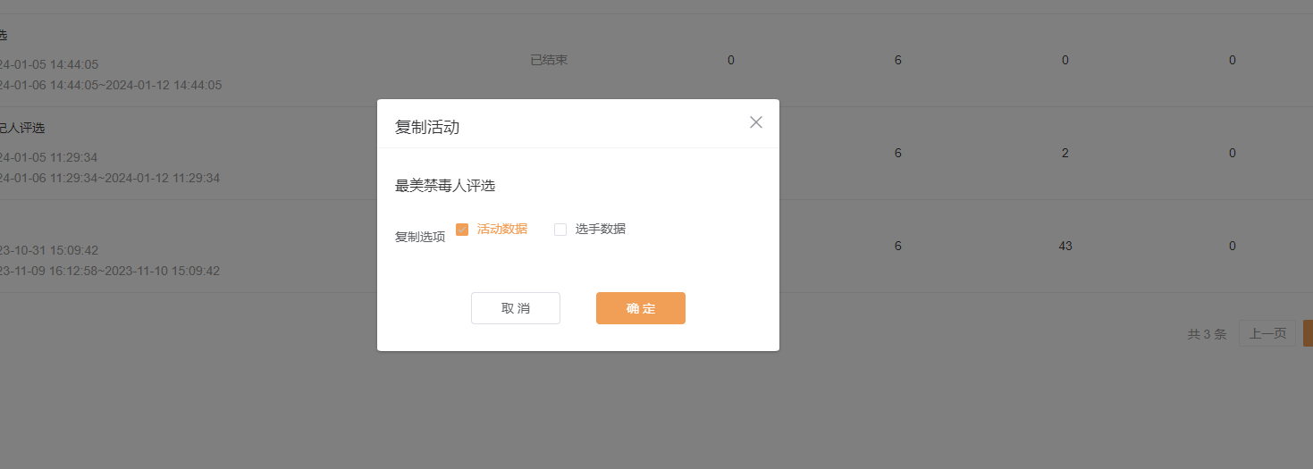 而在每个活动的右侧都有【操作】按钮,点击之后,就可以看到【复制活动】这一选项,点击一下就会出现提示复制选项【选手数据】和【活动数据】,【活动数据】默认必选,而【选手数据】则可以根据我们的需要,选择是否要勾选。