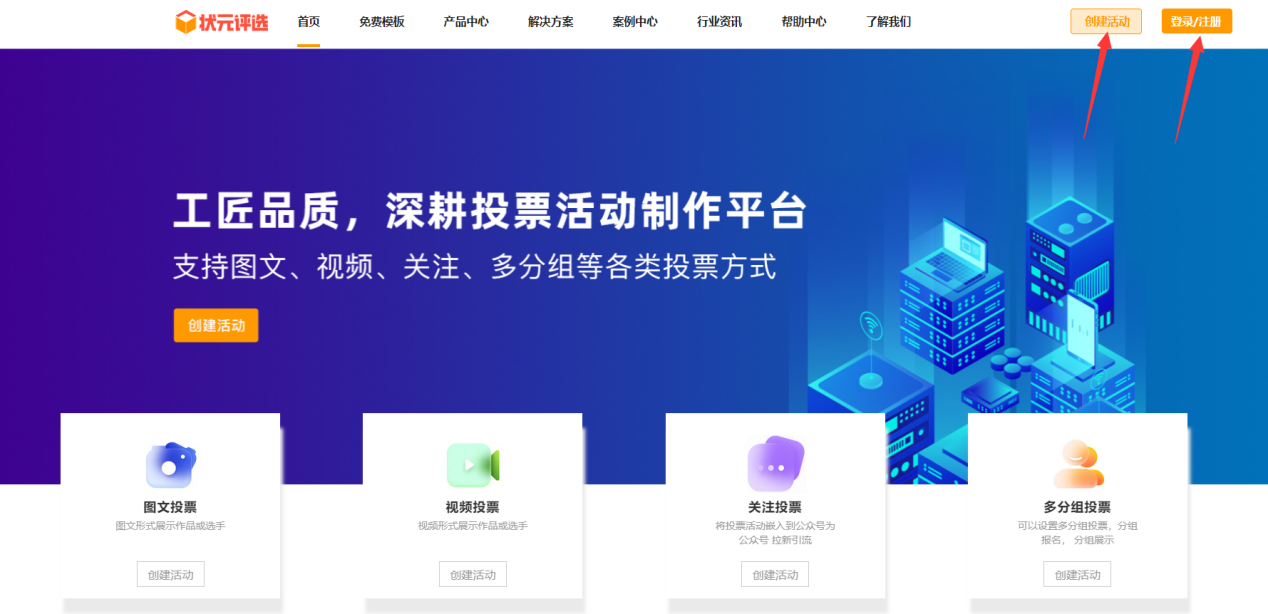 第二步,在首页上,进行账号的【注册登录】,再点击【创建活动】,进入后台管理中心。