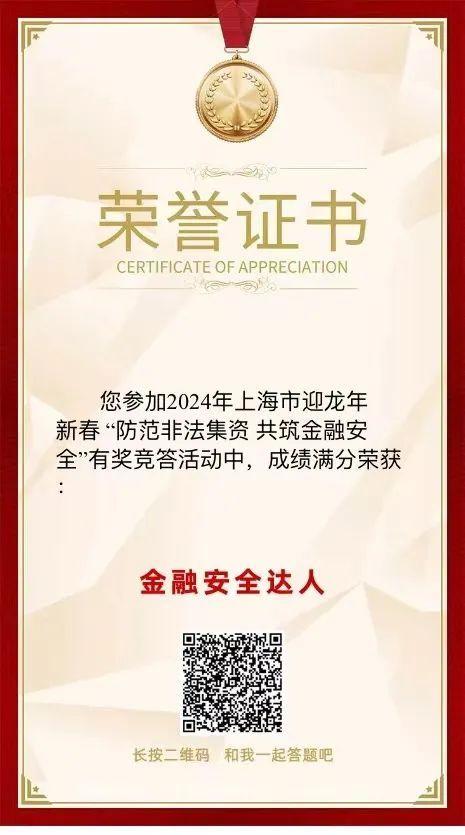 3.用户答题得满分时,即可获得“金融安全达人”电子荣誉证书。(如下图)