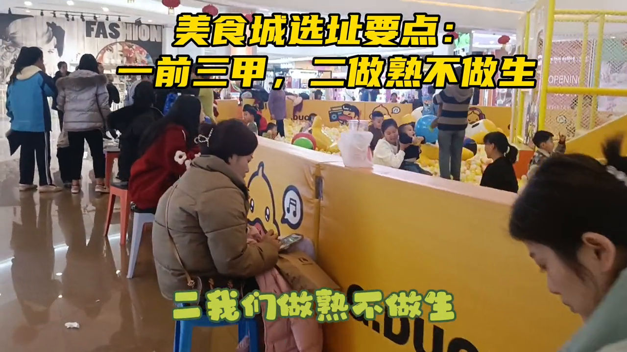 做美食城选址就把握两点就好了:一、选所在城市的前三甲的商圈。二、做熟不做生。也就是要去做成熟的商圈,千万不要去做暖商圈的泡泡。总之一句话:娃娃往哪里走就往哪走。这么多的人是不是都是围着娃娃?孩子们玩累了,大人陪累了,不都得吃饭吗?