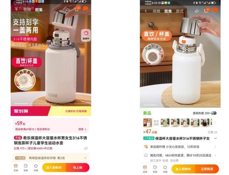 除了饰品品类,我们再拿个生活品类举例,就拿保温杯吧,如果你想卖保温杯,同样也可以做出差异化的视觉。