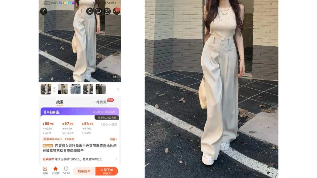 比如我们以1688这条【休闲阔腿裤】为例,这款裤子现在全网热销中,很多商家会直接拿着原图进行售卖。
