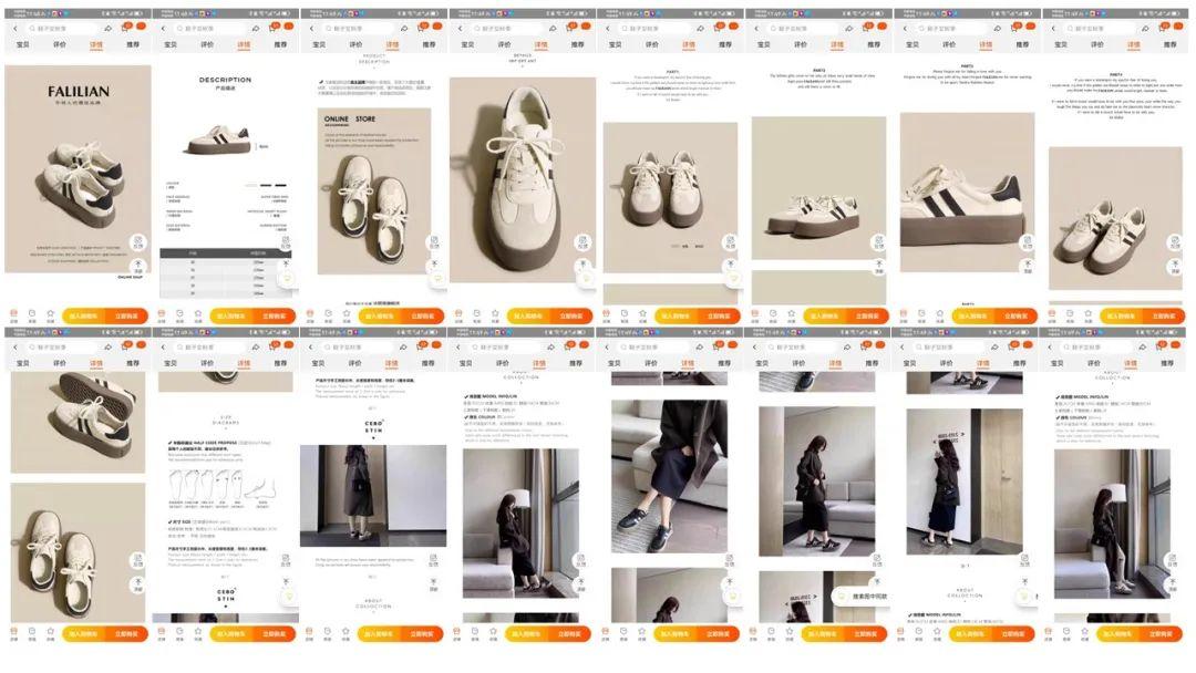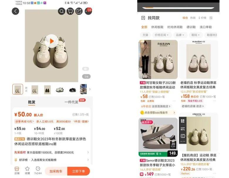 我们同样再以某热款女鞋作为案例。这款休闲平底鞋是当下的爆款,在1688卖掉了1万多双,整个淘宝共有几十家店在买它,甚至大家的图片都是一模一样。完全是硬碰硬的对决。