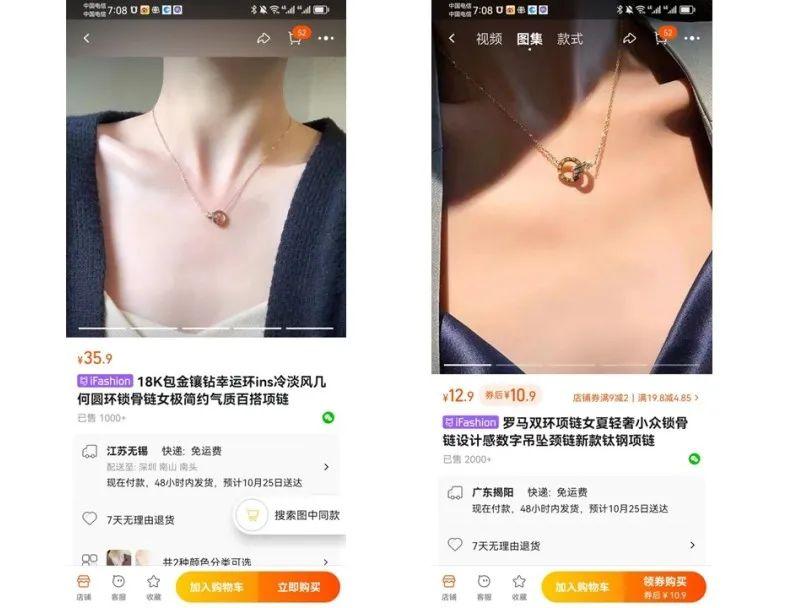 比如有的商家,拿到项链后,会通过这种放在手部的特写展示,拍出另一种风格的产品展示图。这是最简单的差异化表现形式。