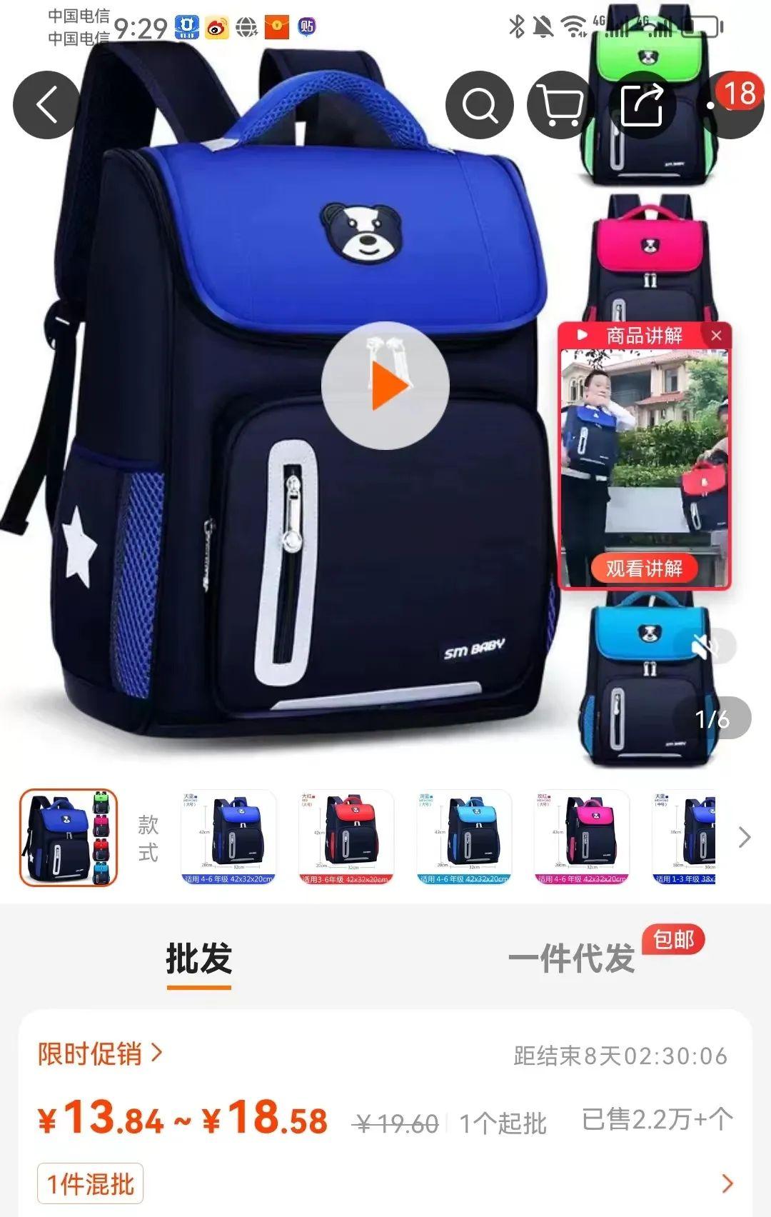 这款来自1688的儿童书包售价为18.8元,整个的产品视觉为纯白底图。