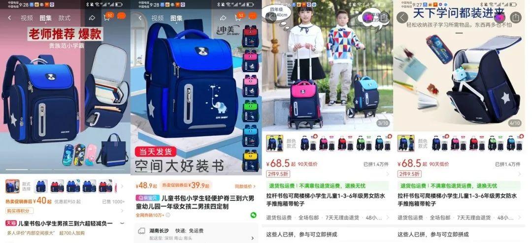 拼多多和淘宝的商家将这款产品拿到后,重新做了视觉,有重新对背景进行了PS,有找了儿童模特进行了重拍,有的进行了创意的表达方式。虽然整个视觉的水平都较为一般,但和原图产品打出了差异化。
