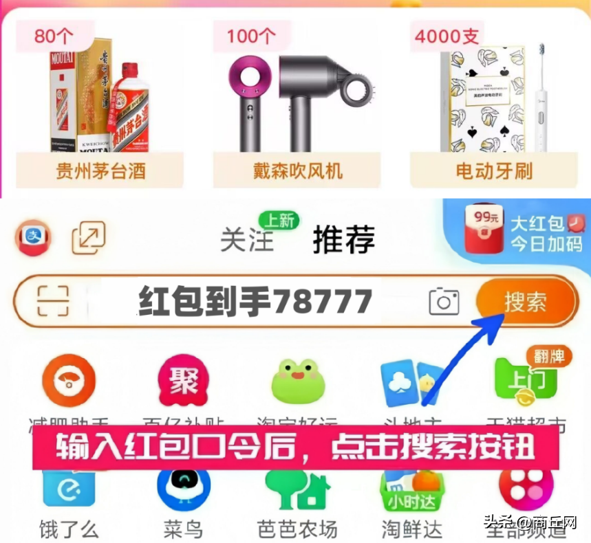 呃,家人们紧急通知:有两件事情,第一件就是在每天早上的11点整的时候,你通过淘宝搜索栏搜索【红包到手78777】进入这个超级红包会场之后,你就可以领到一个超级红包,这个是无门槛的,而且这个面额一定是大额的。而且记住了这个是额外加码次数,也就是说你除了在11点整的时候通过淘宝搜索【红包到手78777】进入这个会场领到一个红包之后,你还可以先退出会场,然后再次搜索进入,这样的话你还是可以领到一个红包。