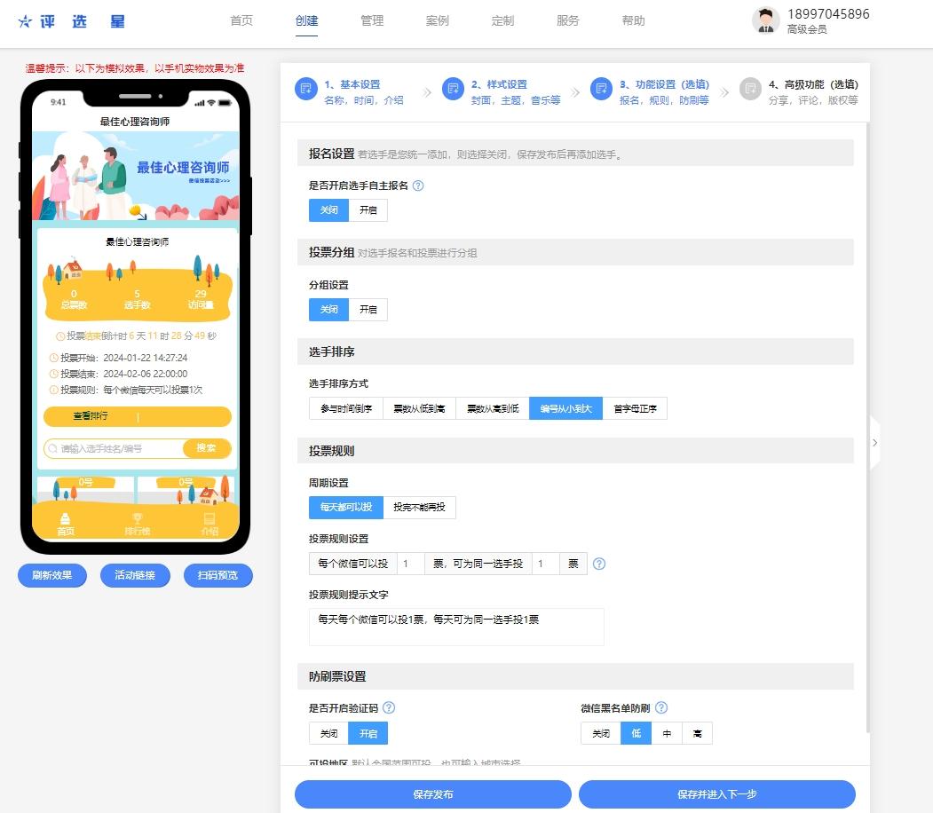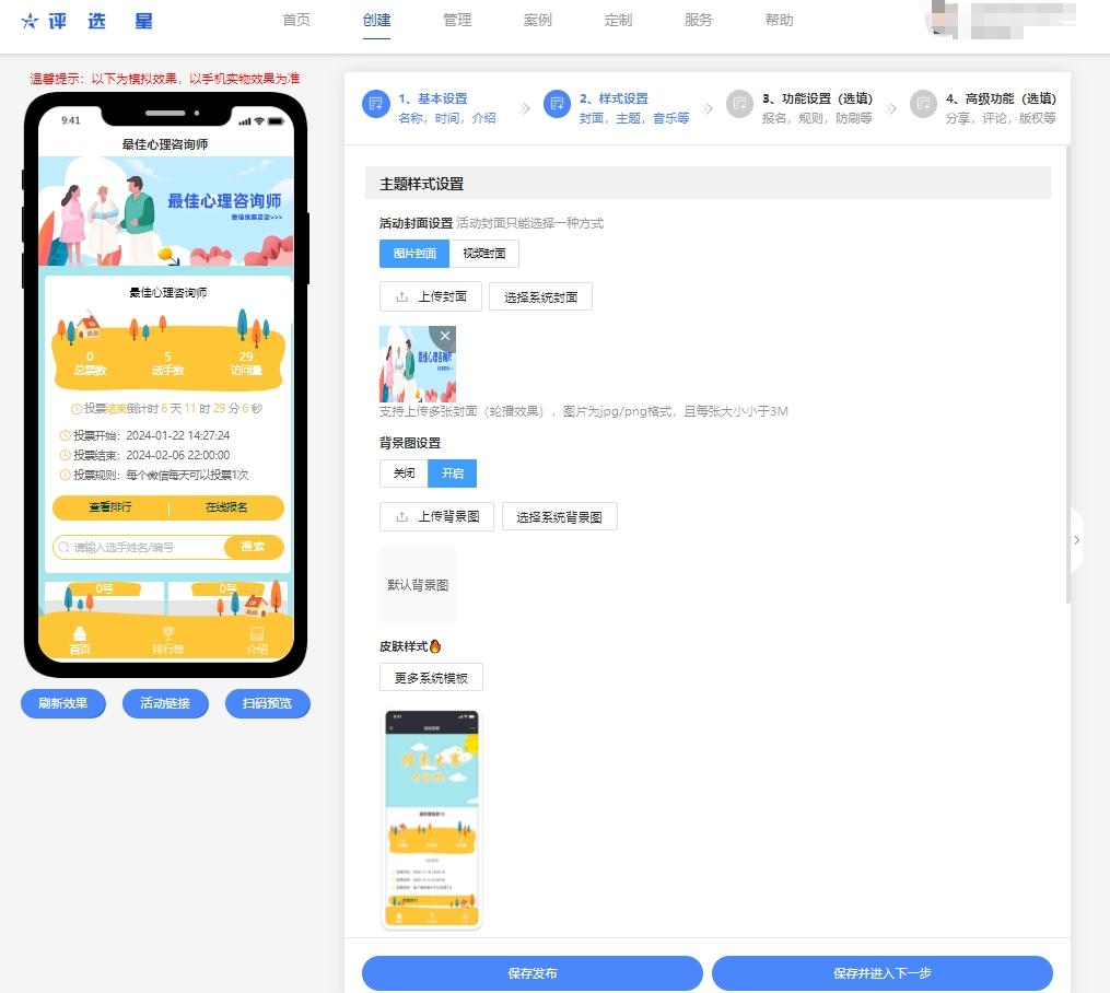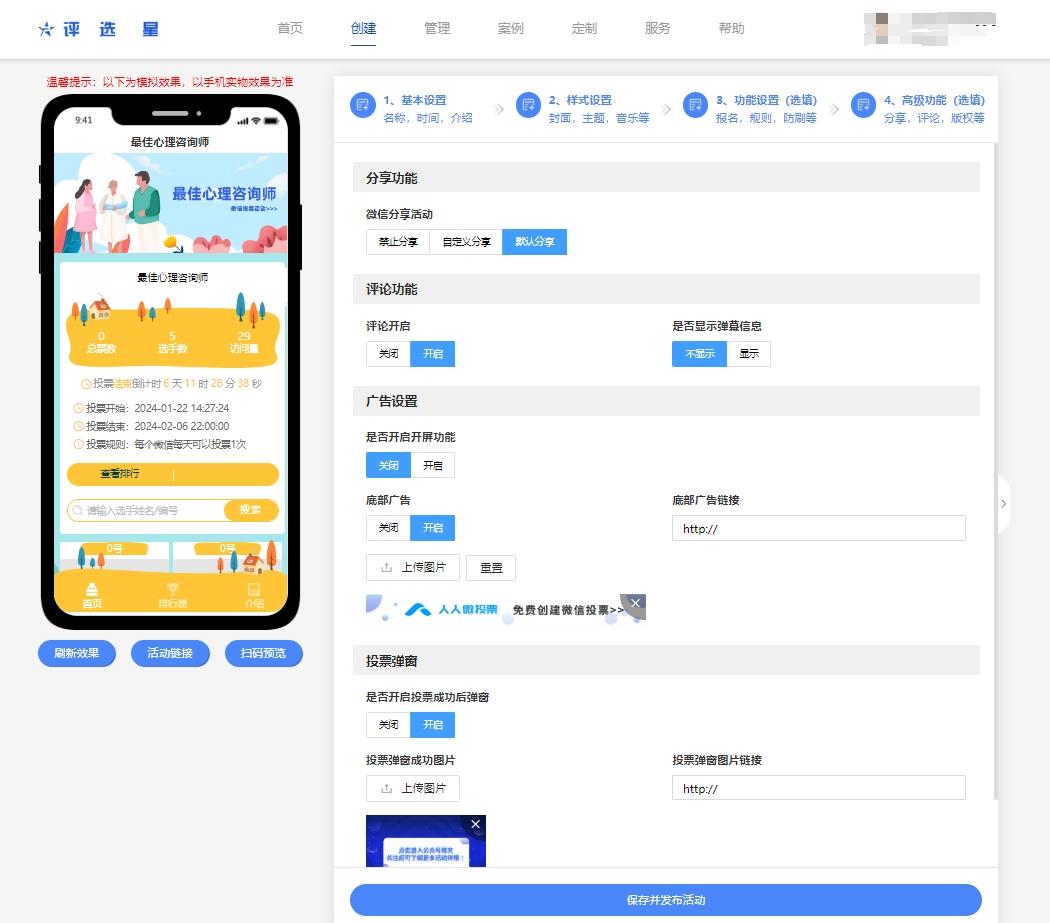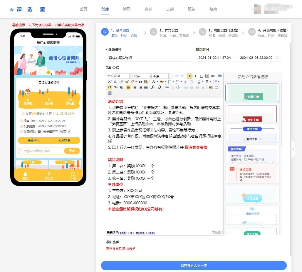 输入活动名称(如XXX最佳心理咨询师投票评选)、内容介绍、活动开始和结束的时间。