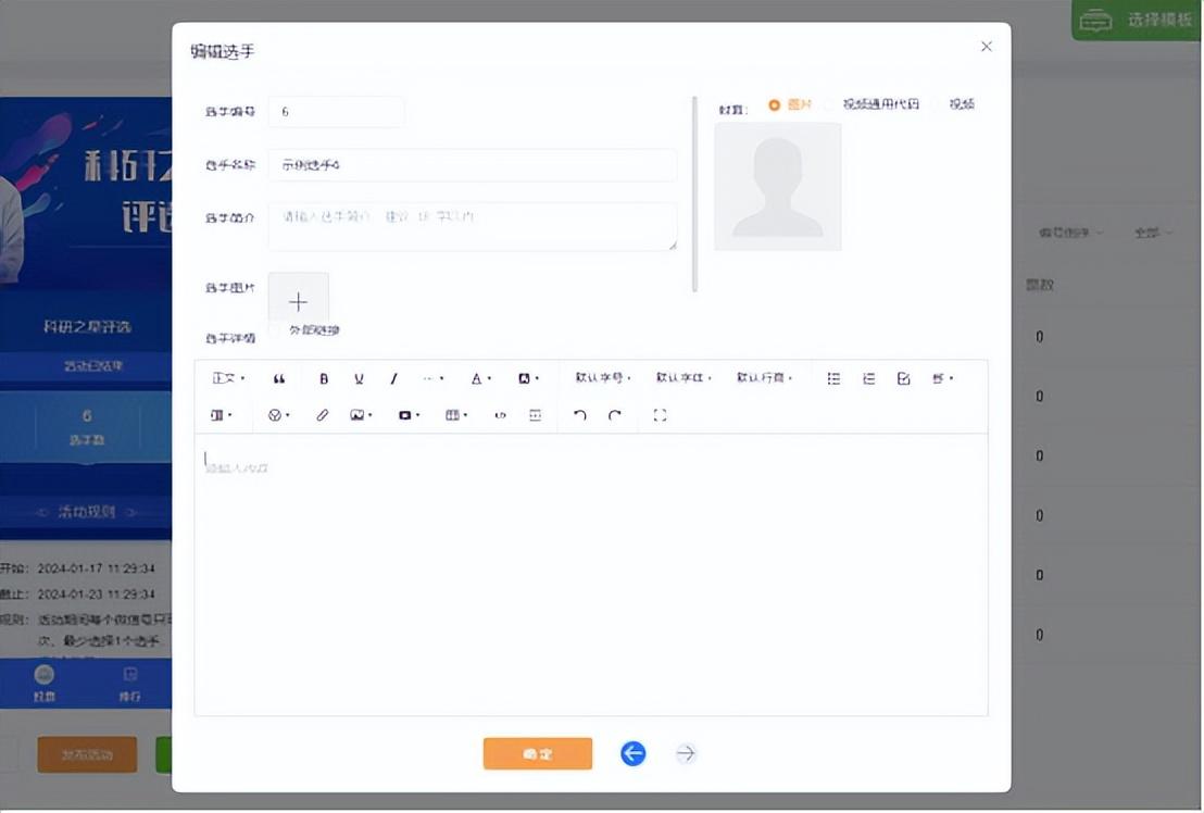第五步,进入到【选手管理】页面,上传所有科研之星候选人的资料,包括他们的名字、简介,以及照片或者视频等。