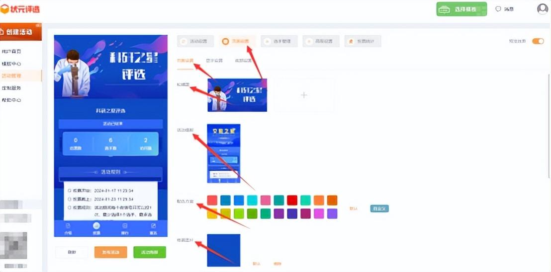 第四步,在【页面设置】中,上传一张活动轮播图封面,并根据我们自己的喜好以及活动的需要,更换配色方案、背景图片、添加漂浮物等。