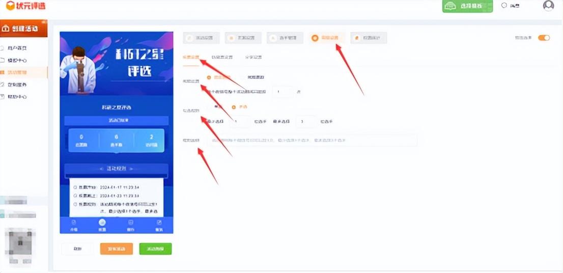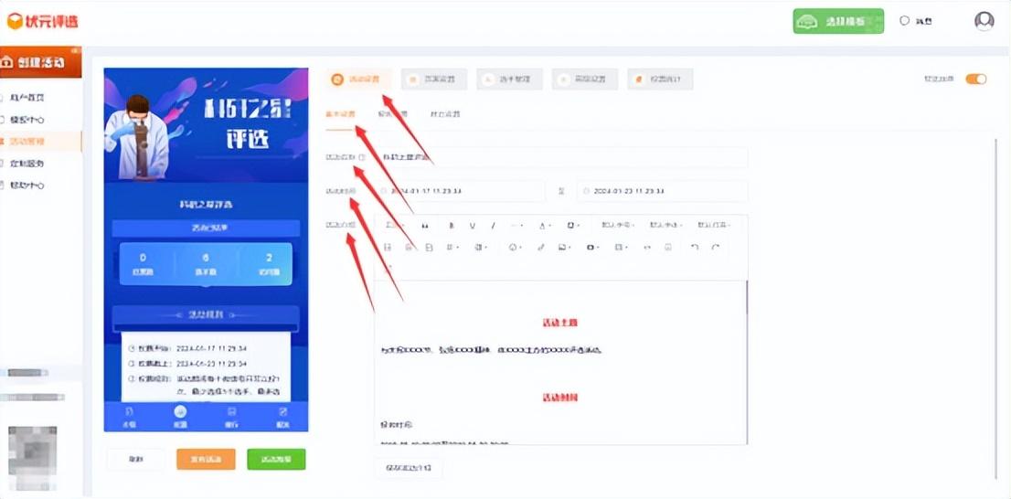 第三步,进入到【活动设置】编辑页面,在这里将活动的名称改成科研之星评选,并设置活动的时间和介绍