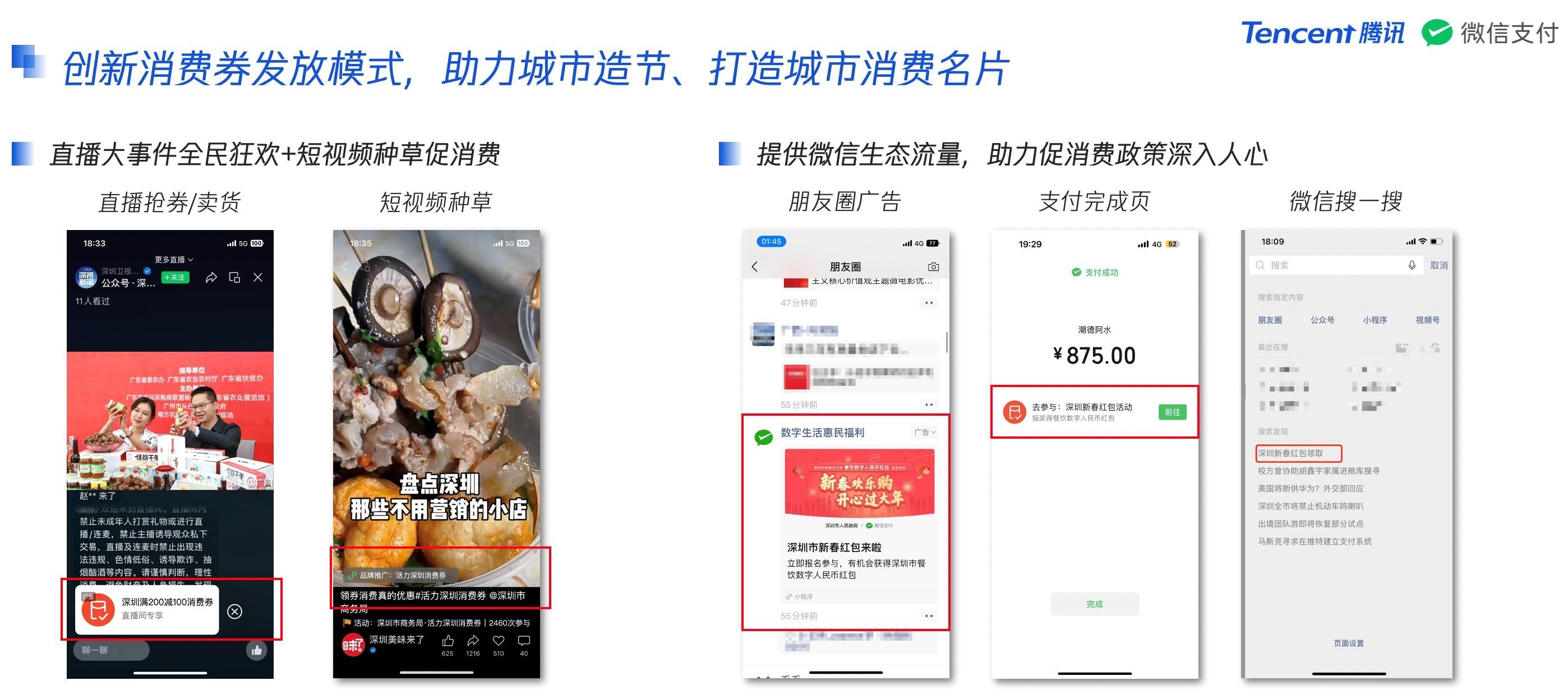 同时,为帮助促消费、暖民心政策更广泛的传播,腾讯将为政府消费券发放提供包括朋友圈推广、支付完成页展示等在内的微信生态流量,助力促消费政策深入人心,营造市场良好消费氛围。