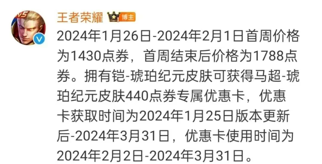 玩家购买这款皮肤之后,还可以领取一项440点券的专属优惠卡,用来购买马超的新皮肤。优惠卡的使用时间为2月2号到3月31号,也意味着马超的皮肤会在2月2号上线。和铠的皮肤一样,马超的这款皮肤肯定也是传说限定品质,不过如果购买了铠的皮肤,价格会便宜很多,只需要九百多点券,就可以获得这款皮肤了。