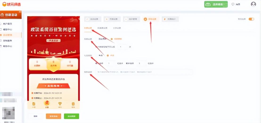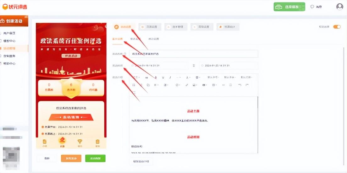再次,在【活动设置】里面,将活动名称改成政法系统百家案例评选,并设置活动开始和结束的时间,以及编辑活动介绍内容。