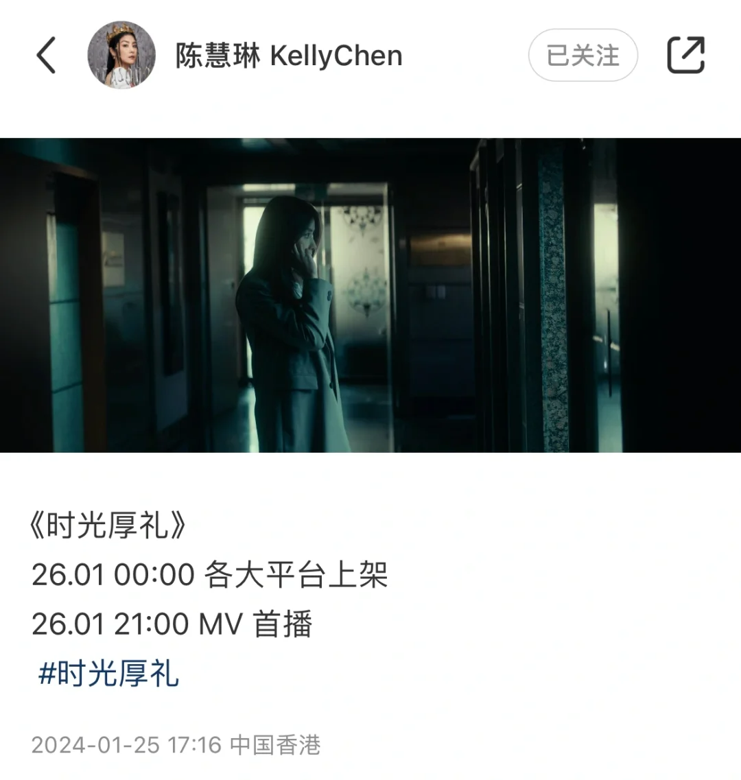 1月26日,陈慧琳全新国语单曲《时光厚礼》上线。唱出你我之间的青春回忆,既温暖又难忘,绝对是一个可一不可再的体会。这次Kelly对于歌词、编曲、以至录音的过程,都投入其中并给予不少意见,实实在在是由Kelly的经历而构成的一份情感,透过她的音乐娓娓道来。
