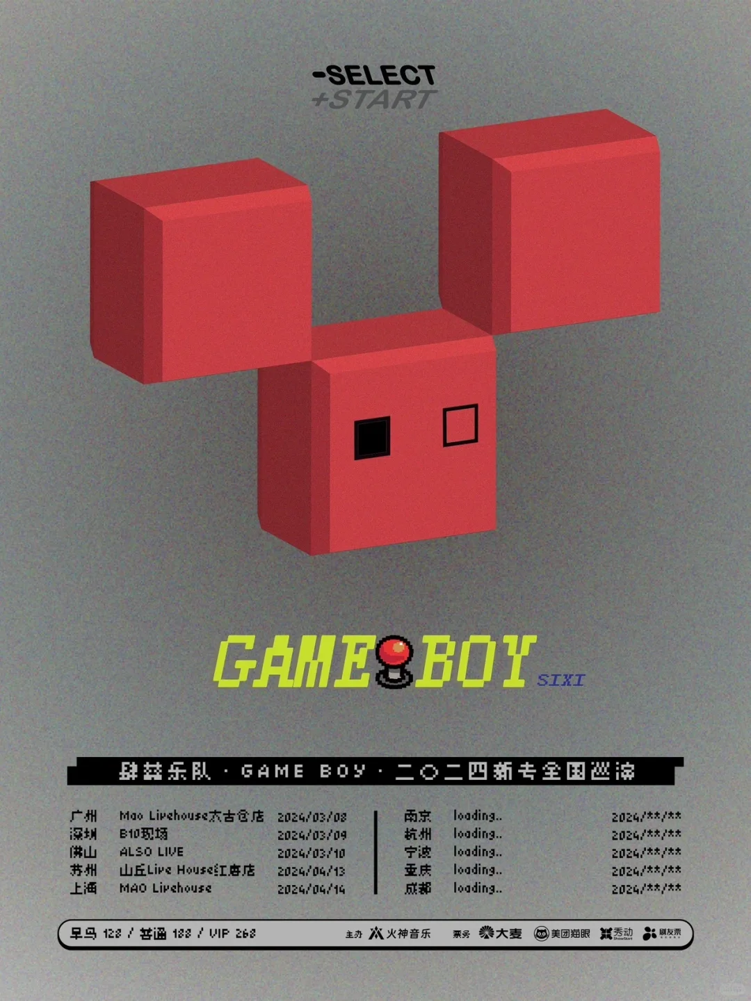肆囍乐队「GAME BOY」二O二四新专全国巡演上海站,演出时间为4月14日,售票平台为秀动、大麦、猫眼、剧友票,目前已开票。