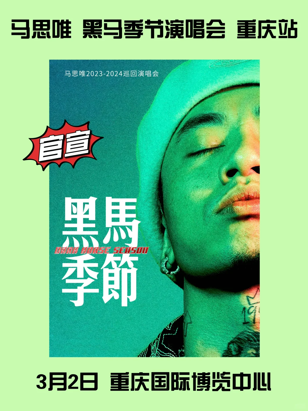 2024 马思唯“黑马季节 Dark Horse Season”世界巡回演唱会重庆站定档3月2日,演出地点为重庆国际博览中心,2月2日13:00纷玩岛、大麦将开启预售。