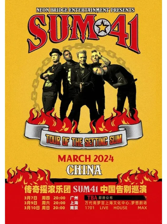 Sum 41即将来华演出。Sum 41 告别巡演中国站包含3场演出,分别为3月7日广州站、3月9日上海站、3月10日南京站,开票时间为年1月29日12:00。