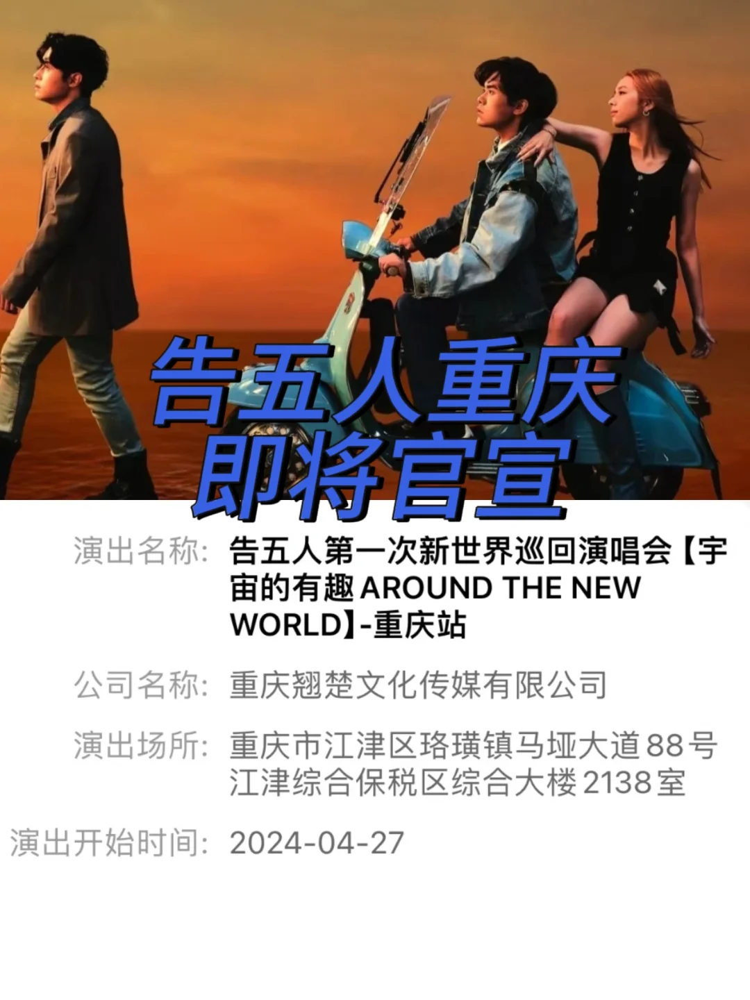 告五人2024巡回演唱会重庆站定档,演出时间为4月27日。告五人2024巡回演唱会宜兰站、合肥站、重庆站、天津站等城市陆续官宣中!
