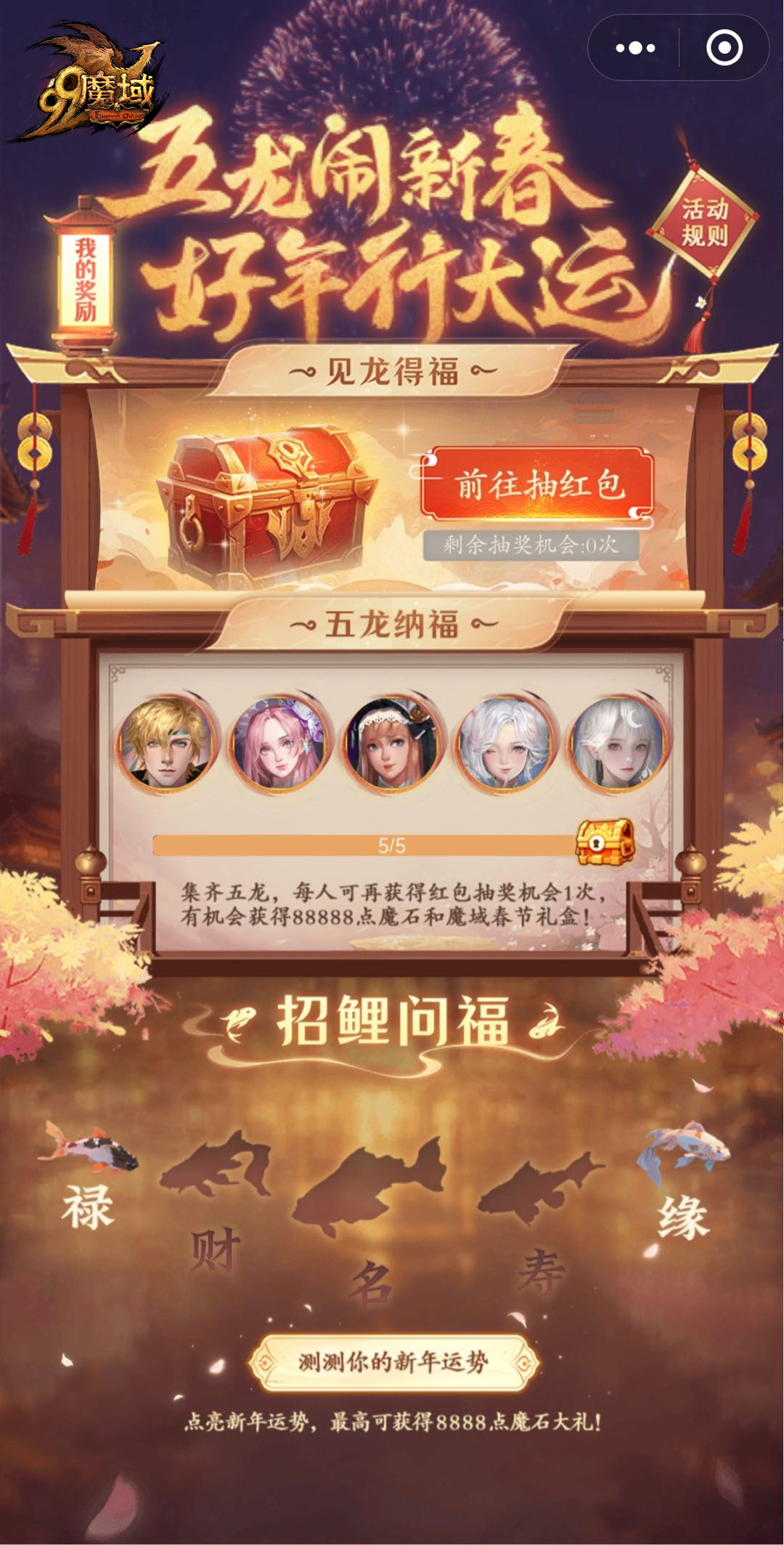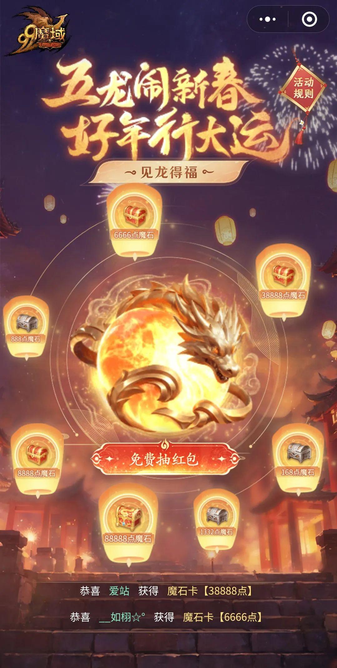 魔友们成功登录账号,即可获得1次玩法一“见龙得福”的免费抽奖机会!最高88888点魔石、38888点魔石等新春礼包豪爽送出,提前给您拜、大、年!