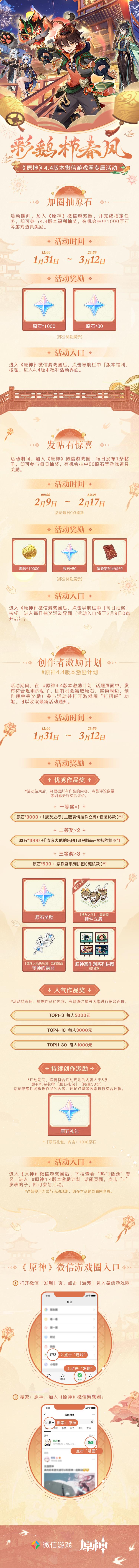 活动期间,加入《原神》微信游戏圈,并完成指定任务,即可参与4.4版本福利抽奖,有机会抽取1000原石等游戏道具奖励(每位旅行者最多3次抽奖机会)。