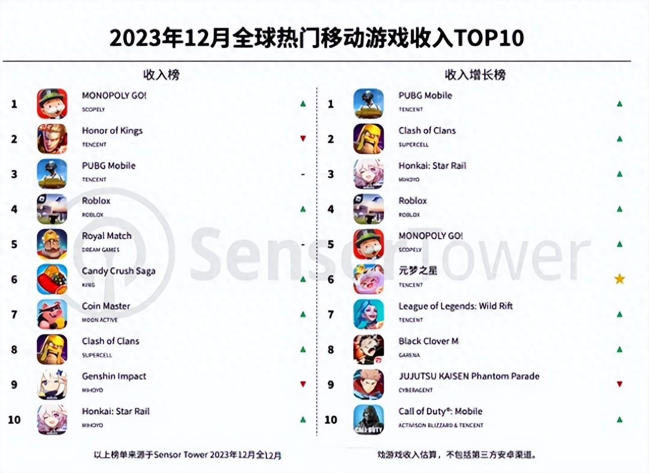 众所周知,手游市场的游戏繁多,各种手游之间都是借鉴热门游戏的。但是呢,尽管手游种类繁多,但是想要知道哪款手游值得玩,玩家数量比较多,我们还是要看收入流水了。这不,去年12月份的手游流水已经出炉,而且还是全球的哦。排在第一的是大富翁GO,而王者荣耀则是被挤到了第二位置。就连和平精英也只能屈居第三。我们可以看到,在这10款热门手游当中,鹅厂还是占据了比较多的名额,其中还有LOL手游哦。至于原神的话,也仅仅是排在了第九的位置。