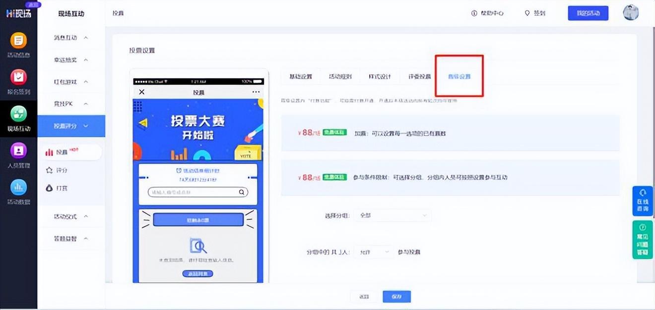 2)参与条件限制:可选择分组,分组内人员可按照设置参与互动