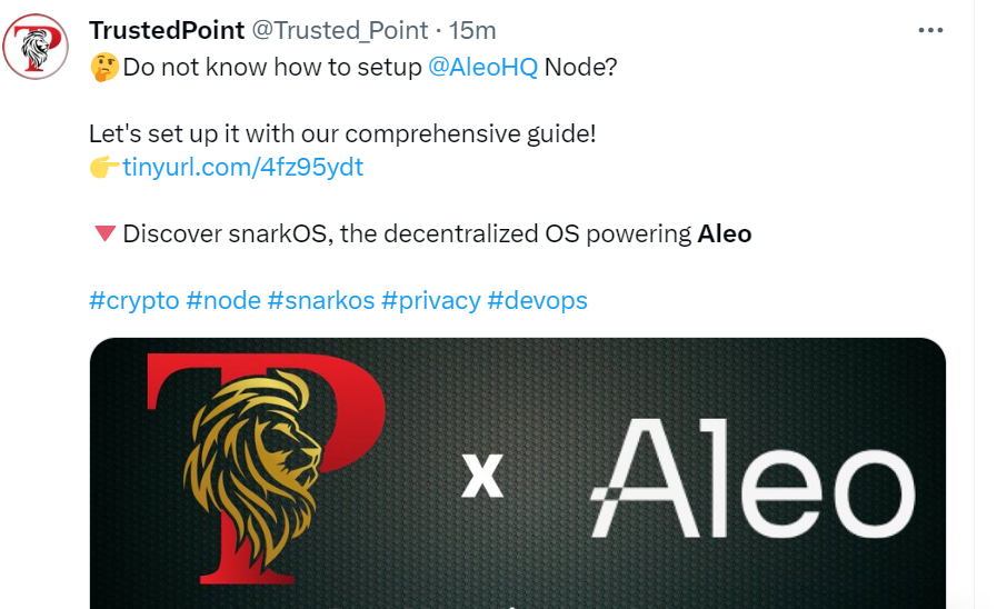 不知道如何设置@AleoHQ 节点?让我们用我们的综合指南来设置它!http://tinyurl.com/4fz95ydt 探索 snarkOS,这是为 Aleo 提供支持的去中心化操作系统。