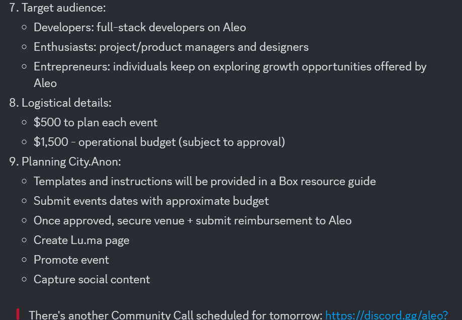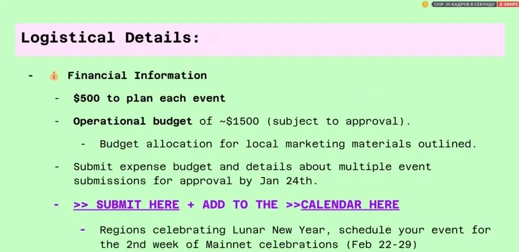 此次会议的大概内容:将在2024年2月15日正式开启主网庆祝活动,各个地方的大使可以申报活动,如果申报成功Aleo官方将对活动举行提供必要的经费。
