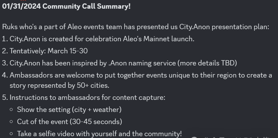 2024年1月31日晚上11点30分,Aleo官方在discord上发表会议。据Aleo官方最新动态公布,2月份主要是主网上线前的宣传活动,各位大使申请举办活动,官方审核通过的可获得经费支持。
