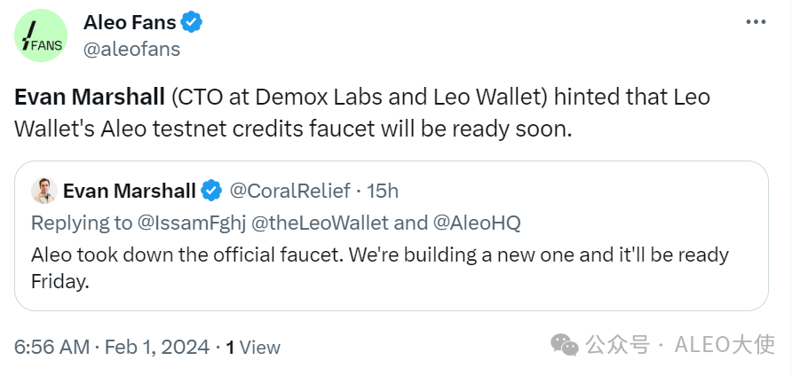 Evan Marshall(Demox Labs 和 Leo Wallet 的首席技术官)暗示 Leo Wallet 的 Aleo 测试网积分水龙头很快就会准备就绪。