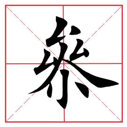整体紧凑,斜势抗肩。撇笔稍重,注意向下角度,勿长,到位后向左切笔轻顿,然后向右上方出提,提锋不要长。右点距离勿远,与提笔起笔在竖中线对称,在字上方时亦可写为撇点,与下一笔相呼应。在书法中,“厶”部有时候可以与“口”部通用。