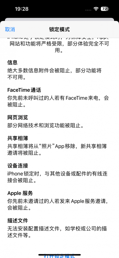 对于普通人来说,能用上锁定模式的概率是比较小的,但万一你是什么跨国公司高管,手机上有无数商业数据却又遭到入侵呢?这时候就能开启锁定模式了,同样是手机重启一次后生效。开启之后部分应用的功能会被限制,只会保留部分基础功能。