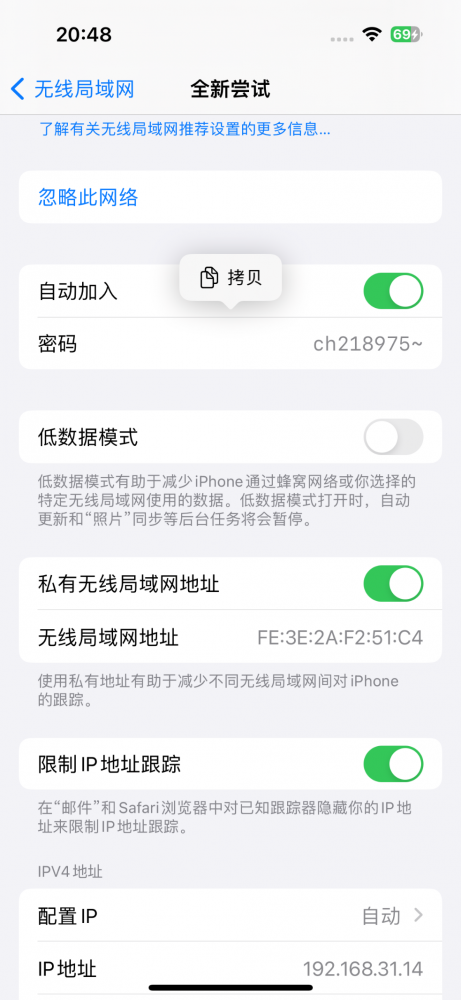 而在iOS16上,想要知道已连接的Wi-Fi密码就很简单了,点击网络详情-密码,就能输入密码查看Wi-Fi秘钥了,非常方便。