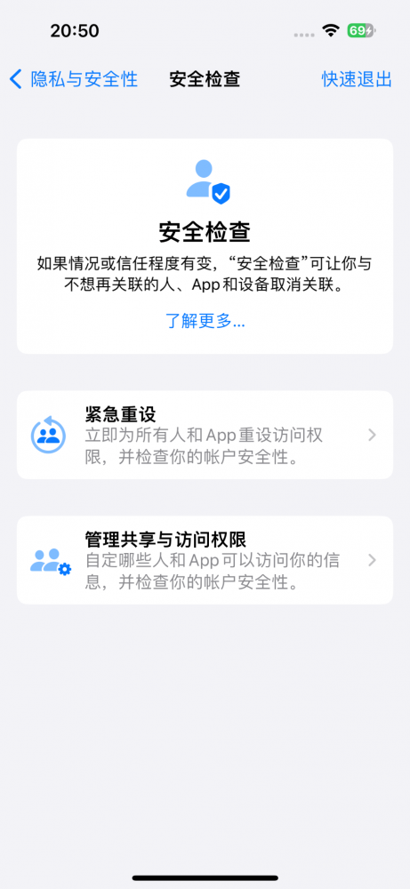 紧接着前面两个安全功能讲起,苹果在iOS16中增添了安全检查这一功能。同样是在“隐私与安全性”中,新增了一个“安全检查”功能。这一功能可以快速终止与他人共享的信息,包括健康、日历、笔记、照片等原生应用。