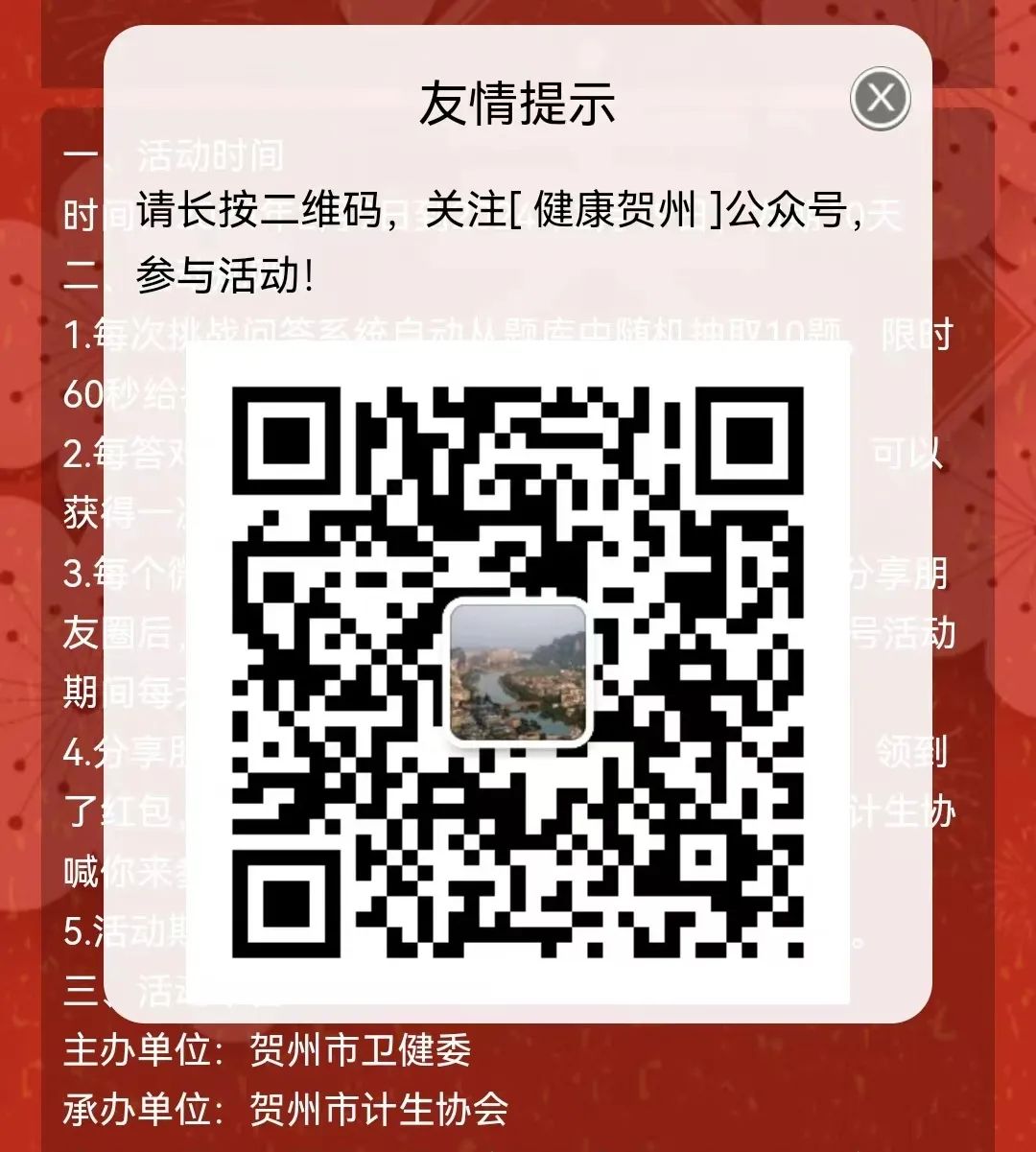 当前位置: 首页福利线报正文 【资源之家】每日免费更新最热门的副业项目资源 今天是除夕 抢红包活动来应景啦! 为助力健康中国行动,进一步普及健康知识和技能,推进健康家庭建设,让“每个人是自己健康第一责任人”的理念深入千家万户,营造人人追求健康生活的良好氛围,由贺州市卫健委主办,贺州市计生协会承办的“迎新春、庆团圆、话健康”健康知识线上答题活动开始啦! 活动时间 2024年2月9日到2024年2月18日 为期10天 活动规则 (一)每次挑战问答系统自动从题库中随机抽取10题,限时60秒给参与者回答。 (二)每答对1题,分数增加10分,答对8题即80%,可以获得一次抽红包的机会。 (三)每个微信号每天可以参加一次红包答题活动,分享朋友圈后,还可增加一次抽红包的机会。每个微信号活动期间每天有2次答题机会。 (四)活动期间每天发放1000元现金红包,领完为止。 参与方式 大家可以滑动此条推文至文末 点击“阅读原文”进入答题页面 进入答题页面后 点击“现在开始” 长按关注“健康贺州”微信公众号 (如已关注公众号的,可忽略次操作) 关注公众号后,返回答题页面 再次点击“现在开始”后,登记个人信息后 就可以开始愉快的答题啦! 叫上你的小伙伴 一起来答题领红包吧! 编 辑 | 蒋雯 审 核 | 王晓鲁 【资源之家】每日免费更新最热门的副业项目资源 推荐阅读腾讯视频VIP+亚马逊Prime=6折会员套餐,PK 爱奇艺VIP+京东Plus这6个创业项目将代表长沙赛区进军全国总决赛清冷儒雅的男生名字,古风味十足给力项目:资源之家会员可免费下载 加入会员 友情提醒: 请尽量登录购买,防止付款了不发货! QQ交流群:1059819594 站长微信:2332379声明:本站内容均转载于互联网,并不代表资源之家立场!如若本站内容侵犯了原著者的合法权益,可联系我们进行处理! 拒绝任何人以任何形式在本站发表与中华人民共和国法律相抵触的言论! 资源之家永久会员 打赏 收藏 海报 链接