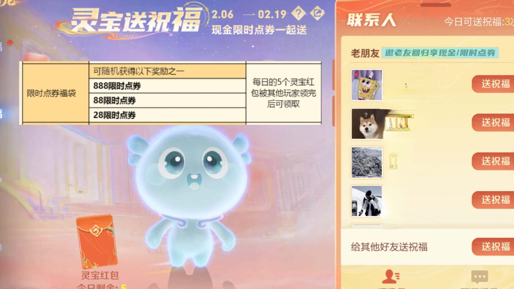上面的活动获得限时点券的并不多,但是在2月6日~2月19日期间,玩家通过灵宝送祝福活动,每天给5位好友送祝福,每天可以抽取限时点券,金额就是28限时点券、88限时点券以及888限时点券。这样折算下来,一共有14天,运气好的话,是可以获得10000多限时点券的,相对来说比较不错。