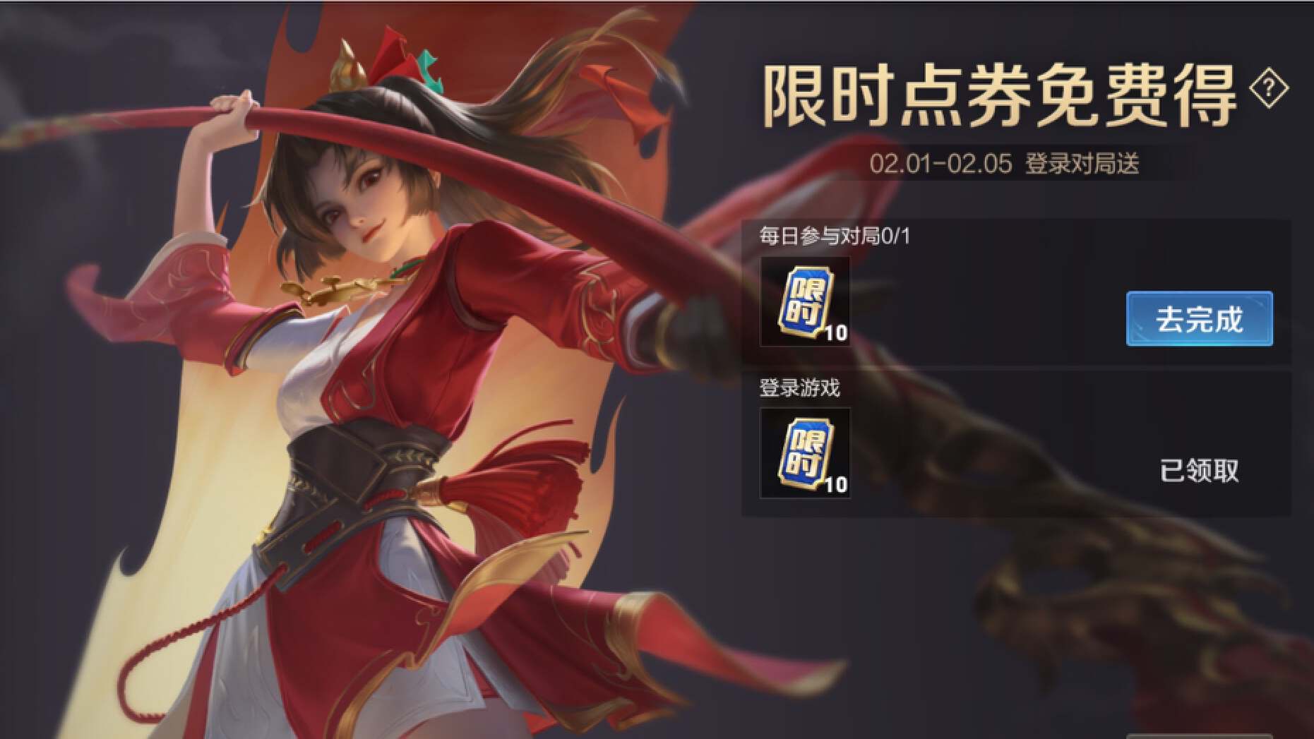 第一个就是在2月1日~2月5日期间玩家登录游戏并且参加对局就可以每天获得20限时点券,这个活动期间玩家一共可以获得100个限时点券。
