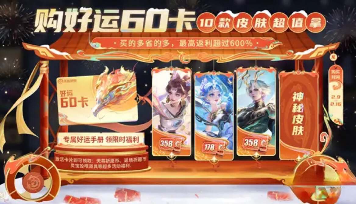 王者荣耀春节期间上架了很多新皮肤还有新活动,其中赠送的限时点券、灵宝市集皮肤的类型以及60卡福利的升级,也是吸引了很多玩家。