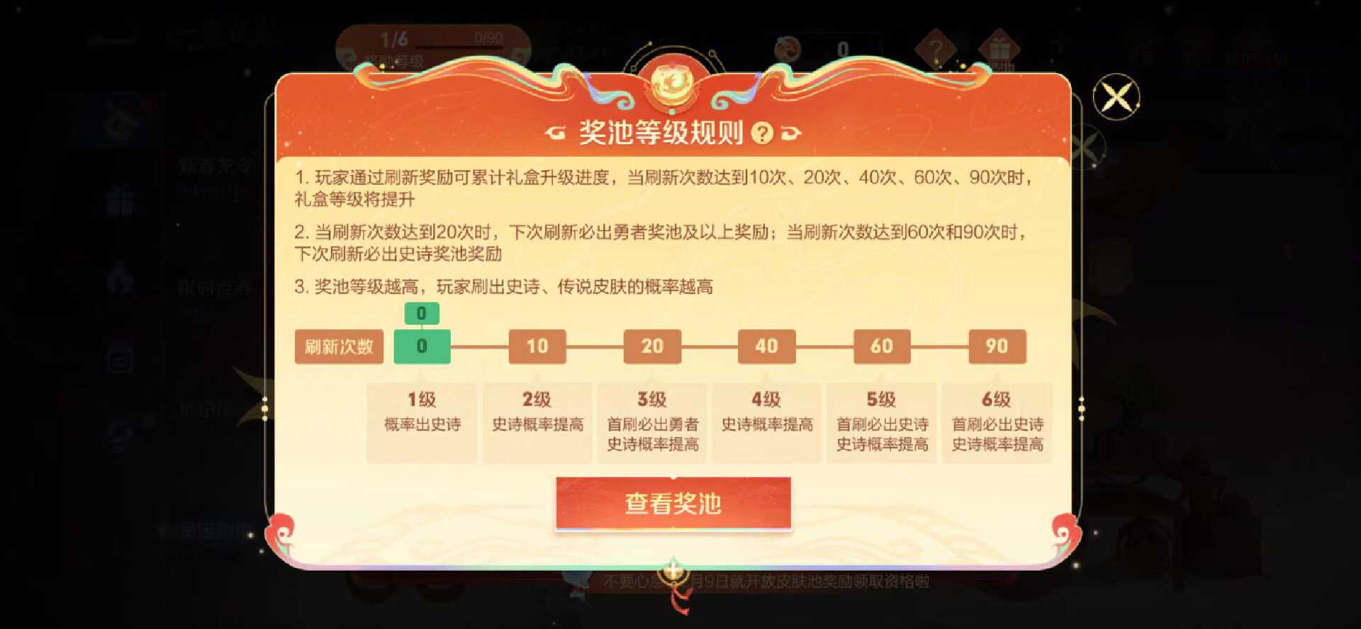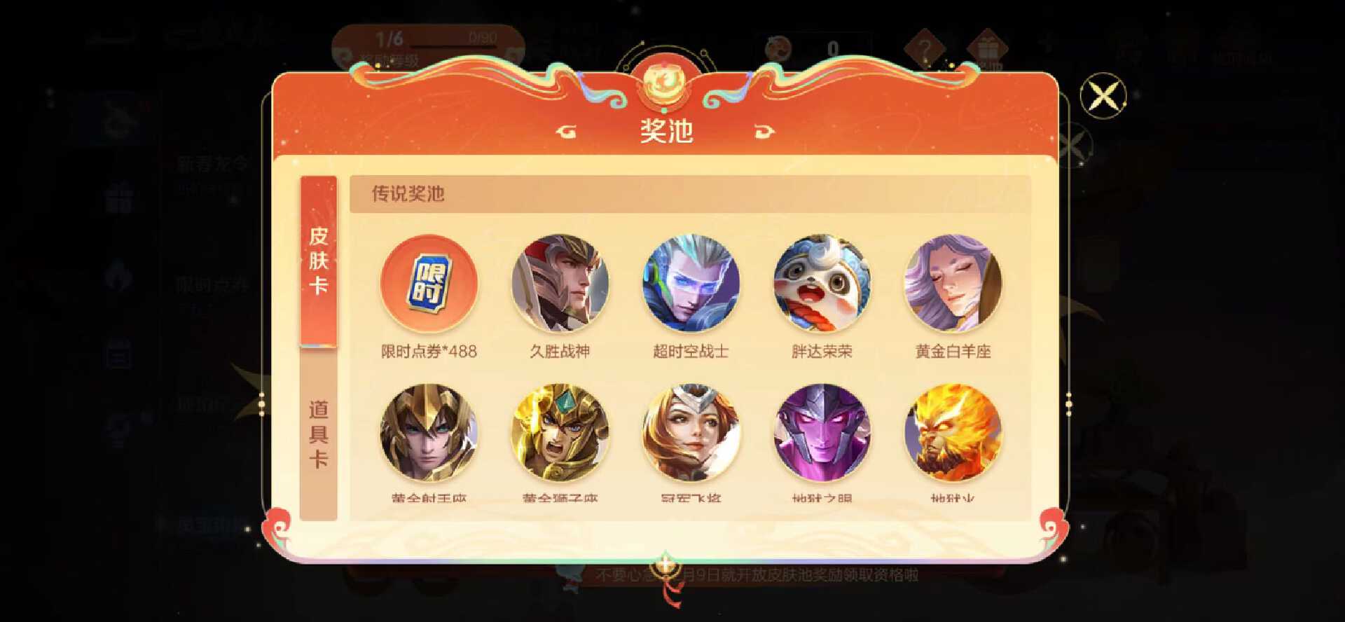 当然,如果没有那么多皮肤的玩家,做任务提升等级,等级得到6级之后,也是可以获得传说皮肤的。尽管运气没有那么好,没有传说皮肤,只要玩家在2月9号登录游戏,就可以刷新到一款史诗皮肤,怎么说这个活动也是特别超值的。