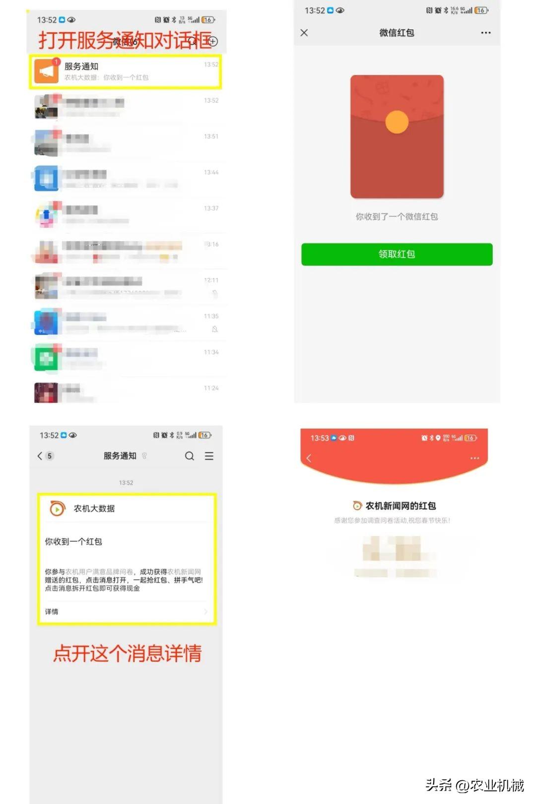 本次活动中的所有奖励均以微信红包的形式发送,您在收到获取红包提示后,需前往“农机大数据”微信公众号“会话”页面领取。(注意:红包的有效期为24h,过期将会被退回,请务必及时领取。)