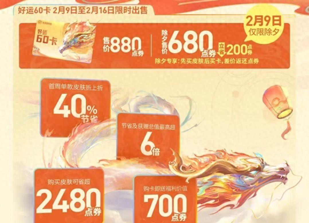 简单来说,无论你是先购买新皮肤还是先购买好运60卡,在除夕当天都不会亏差价。而且如果你购买了五款年限皮肤,则相当于花了5710点券,并且直接达到双倍贵族积分上限。此外,在除夕当天贵族积分翻倍上限为5000点。