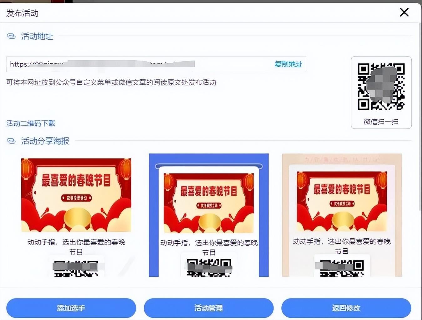 6.发布分享:点击底部“保存并发布活动”,就能获取活动地址、二维码和海报,转发到微信中后,即可开启大众投票了。