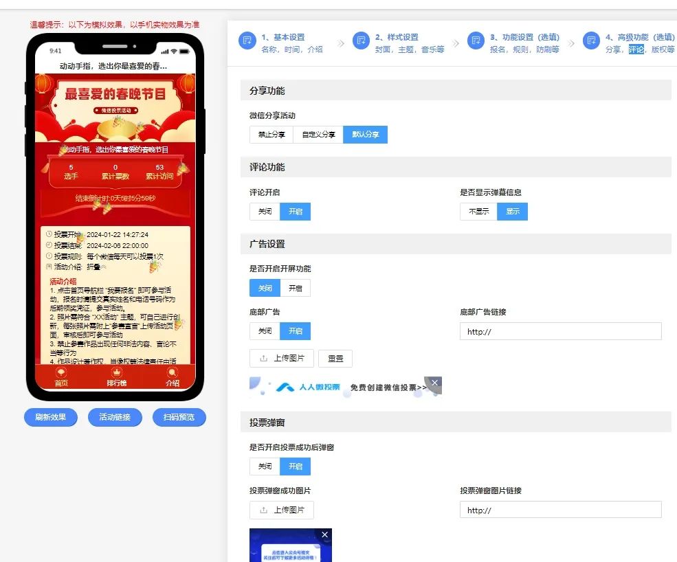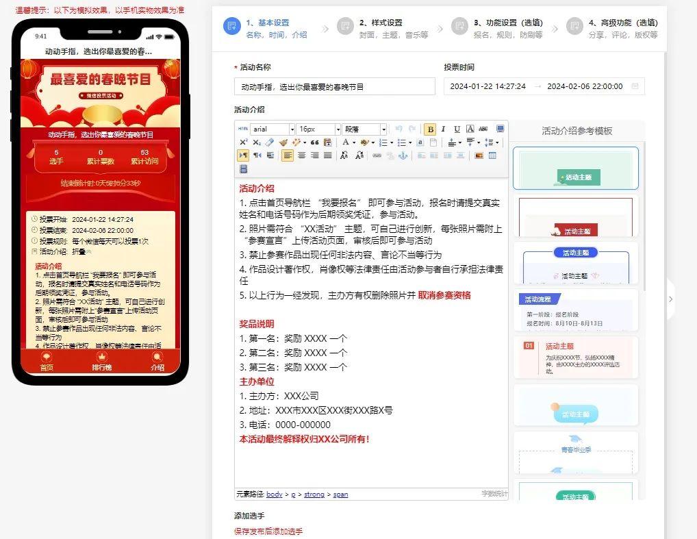 2.基础设置:设置活动名称(例如:动动手指,选出你最喜爱的春晚节目)、活动开始及结束时间、活动介绍内容等。