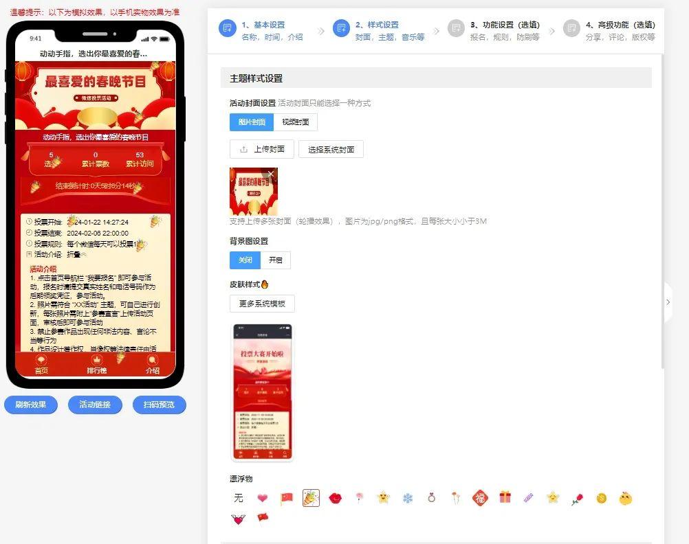 3.样式设置:可以选择较为喜庆,年味较浓的活动封面和皮肤样式,还能添加漂浮物、背景音乐等,进一步渲染过年气氛。